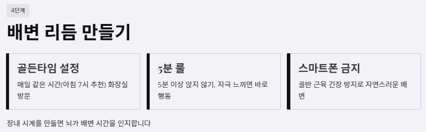 장내 시계가 생기면 뇌가 "이제 배변할 시간"이라고 인지해 자연스러운 리듬이 만들어집니다. 이 변비 해결방법은 1주일 집중하면 효과가 확실히 나타납니다.