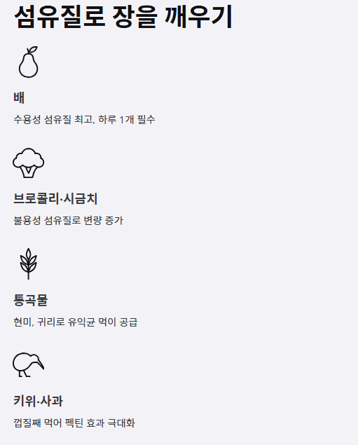 - 키위·사과(껍질째): 펙틴으로 장 운동성 개선