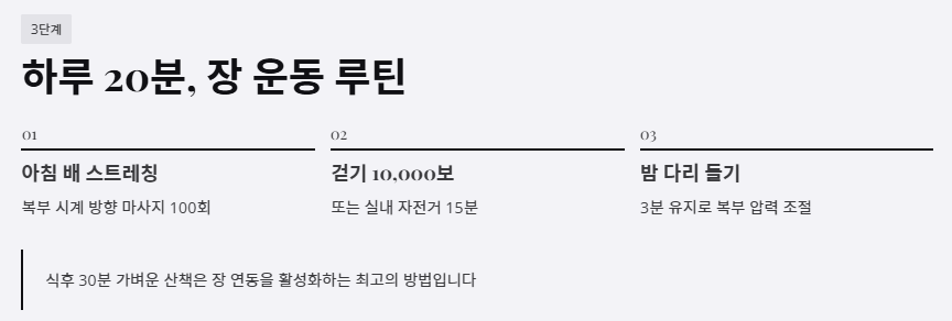 특히 식후 30분 가벼운 산책은 장 연동을 활성화하는 최고의 변비 해결방법입니다. 앉아서 일하는 사람은 1시간마다 2분씩 일어나 걷는 습관이 필수입니다.