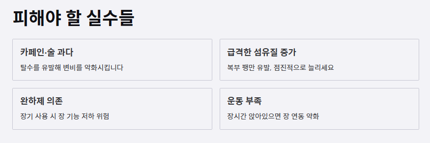급격한 섬유질 증가 시 복부 팽만이 올 수 있으므로, 첫째 날 10g, 둘째 날 15g씩 점진적으로 늘리세요. 이 변비 해결방법이 가장 확실한 장기 효과를 줍니다.
