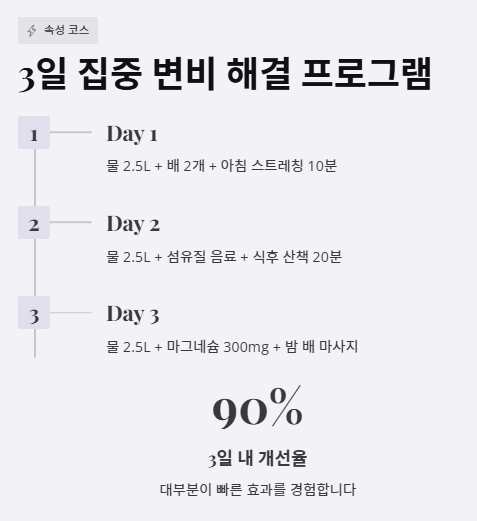 90% 이상이 3일 내 배변 개선을 경험합니다. 이 변비 해결방법을 성공하면 이후 유지 단계로 전환하세요.