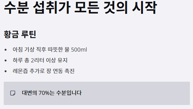 대변의 70%가 수분이므로, 물 부족은 변이 딱딱해지는 가장 큰 원인입니다. 변비 해결방법으로 첫날부터 물병을 가까이 두고 꾸준히 마셔보세요.
