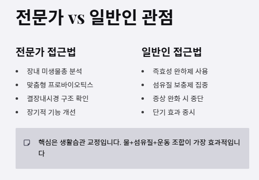 전문가는 예방과 지속성을, 일반인은 즉시 효과를 중시합니다. 하지만 변비 해결방법의 핵심은 생활습관 교정으로, 단기 완하제보다 물+섬유질+운동 조합이 가장 효과적입니다.