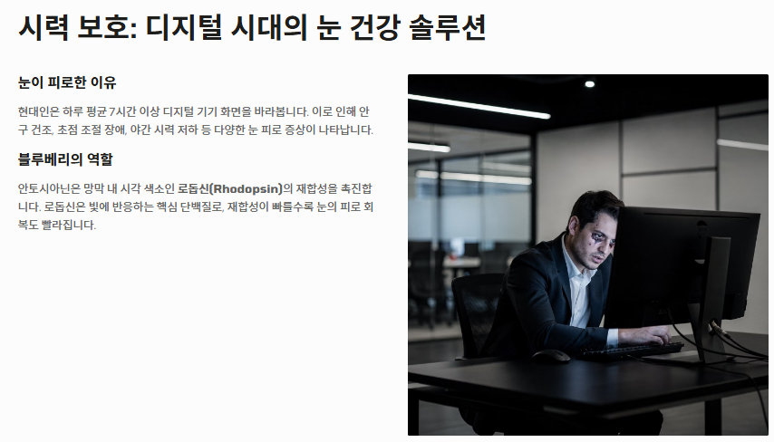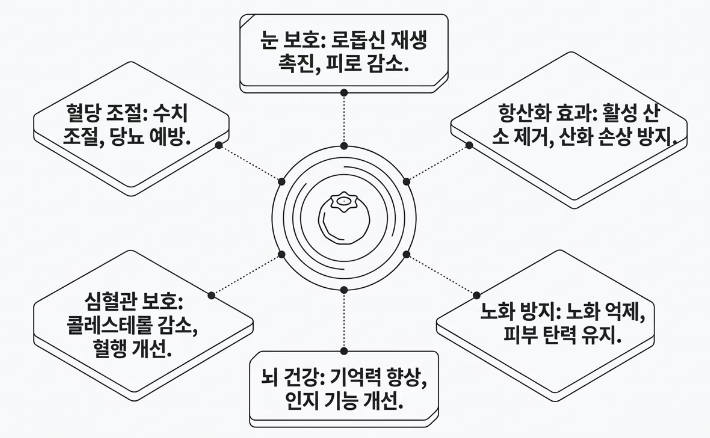 - 시력 보호 및 개선: 안토시아닌은 망막의 로돕신 재합성을 도와 눈의 피로를 풀어주고 시력을 보호합니다. 스마트폰 사용량이 많은 분들에게 블루베리 효능이 필수적인 이유입니다.