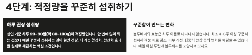 - 하루 적정량을 꾸준히 유지할 때 진정한 블루베리 효능이 나타납니다.