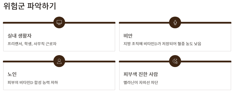 이 위험군이라면 비타민d 부족증상 예방 차원에서 정기 검사를 받는 것이 좋습니다.