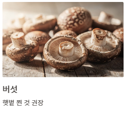 - 연어(100g 500IU), 계란노른자(1개 40IU), 버섯(햇볕 쬔 것)