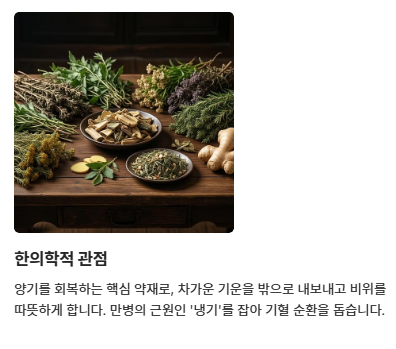 - 현대 의학적 관점 (염증 대사와 항암): 현대 의학은 생강의 화학적 성분에 주목합니다. 아스피린과 유사한 소염 작용을 통해 관절염 통증을 완화하고, 암세포의 증식을 억제하는 항암 보조제로서의 생강 효능을 연구합니다. 특히 임산부의 입덧이나 멀미 증상 완화에 있어 약물보다 안전한 대안으로 평가합니다.