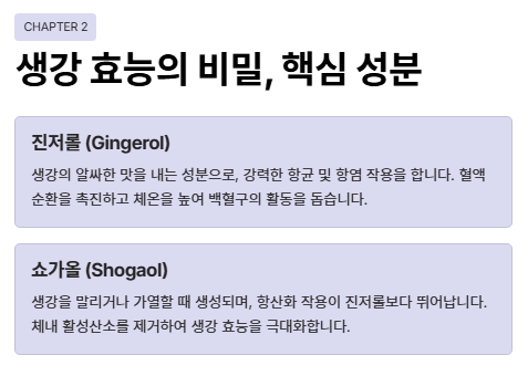 - 진저롤: 생강의 알싸한 맛을 내는 성분으로, 강력한 항균 및 항염 작용을 합니다.