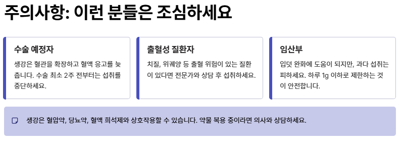 결론적으로 생강은 단순한 음식을 넘어선 '천연 보약'입니다. 하지만 주의할 점도 있습니다. 생강은 혈관을 확장하므로 수술을 앞두고 있거나 치질, 위궤양 등 출혈성 질환이 있는 분들은 섭취에 주의해야 합니다. 이러한 주의사항만 잘 지킨다면, 매일 아침 따뜻한 생강차 한 잔은 여러분의 건강 수명을 늘려주는 최고의 습관이 될 것입니다.