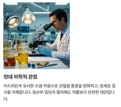 - 염증 완화: 천연 진통제 역할로 관절염 및 생리통 통증을 줄여줍니다.