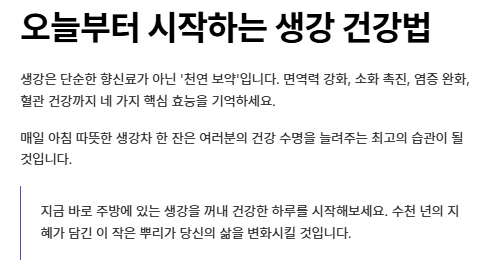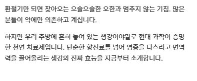 지금 바로 주방에 있는 생강을 꺼내 건강한 하루를 시작해보시는 건 어떨까요?