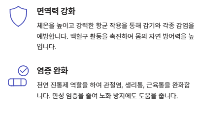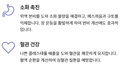 - 면역력 강화: 체온을 높이고 항균 작용을 통해 감기를 예방합니다.