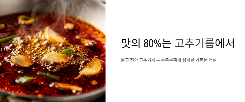 맛있는 순두부찌개의 80%는 국물 위에 떠 있는 붉고 진한 고추기름에서 결정됩니다. 순두부찌개 맛있게 끓이는법에서 가장 공을 들여야 하는 단계입니다.