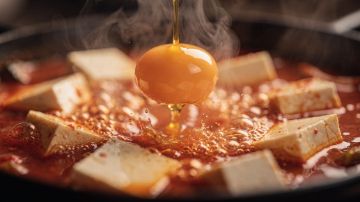 마지막에 대파와 청양고추를 넣어 칼칼함을 더하고, 불을 끄기 직전 계란 노른자를 하나 톡 떨어뜨려 주세요. 마지막에 후추를 톡톡 뿌려주면 풍미가 폭발하는 순두부찌개 맛있게 끓이는법이 마무리됩니다.