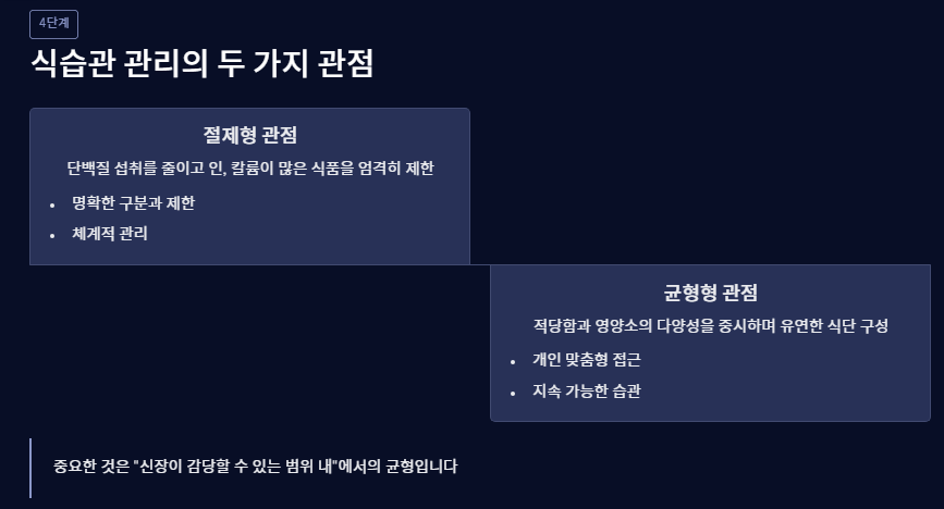 두 번째는 균형형 관점입니다. 이쪽은 완전한 제한 대신 적당함과 영양소의 다양성을 중시하며, 좋은 음식 중심이되 나쁜 음식도 소량 섭취 가능하다고 봅니다.