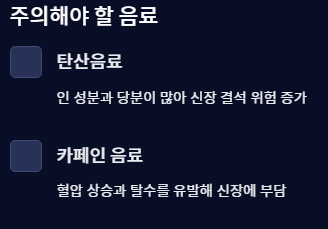 - 카페인 음료 – 혈압 상승과 탈수를 유발해 신장에 부담을 줍니다.