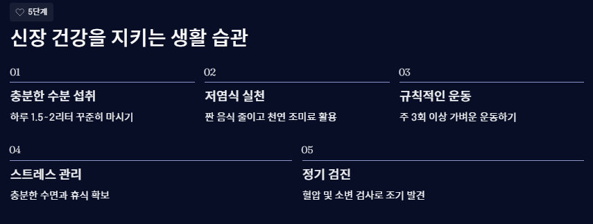이런 습관들은 신장에 좋은 음식 나쁜 음식 관리와 함께 병행될 때 더욱 효과적입니다.