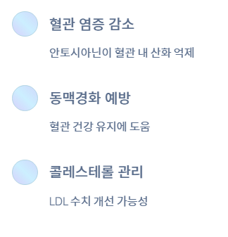 - 아로니아에 포함된 안토시아닌과 폴리페놀은 혈관 내 염증과 산화를 줄여 동맥경화 진행을 늦추는 데 도움을 줄 수 있습니다.