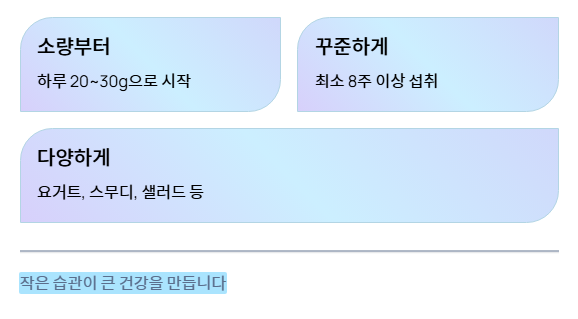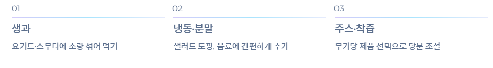 - 생과: 가장 자연스러운 형태지만 떫은맛이 강해 소량씩 요거트·스무디에 섞어 먹는 방식이 좋습니다.