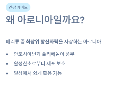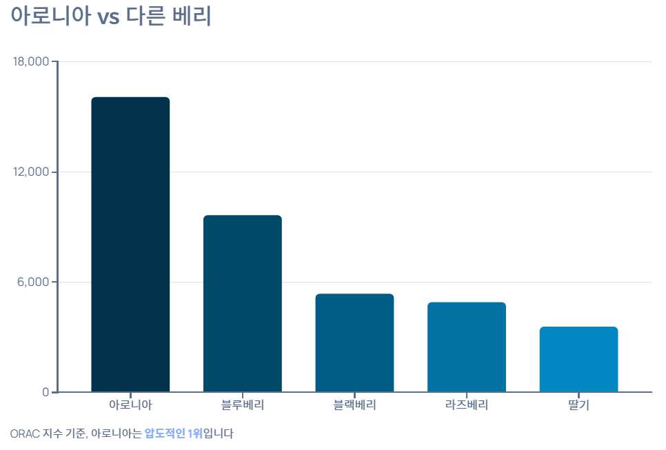 - 아로니아에는 안토시아닌, 폴리페놀 등 항산화 성분이 베리류 중 최상위 수준으로 들어 있어 활성산소로부터 세포를 보호합니다.