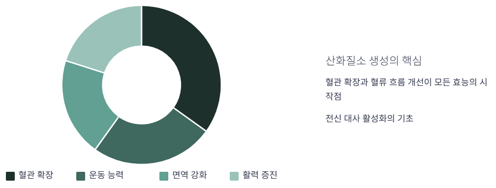 아르기닌은 체내에서 산화질소를 생성하는 유일한 원료입니다. 산화질소는 혈관 벽을 이완시켜 혈류 흐름을 원활하게 하는데, 이는 고혈압 예방과 심혈관 건강 증진이라는 아르기닌의 효능으로 이어집니다.