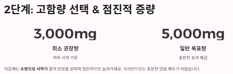 일반적인 식사만으로는 충분한 수치를 얻기 어렵습니다. 보통 하루 $3,000mg\sim5,000mg$ 정도의 고함량을 선택하되, 처음에는 소량으로 시작해 몸의 반응을 보며 늘려가는 것이 아르기닌의 효능을 안전하게 누리는 방법입니다.