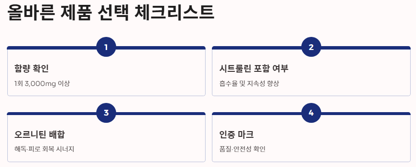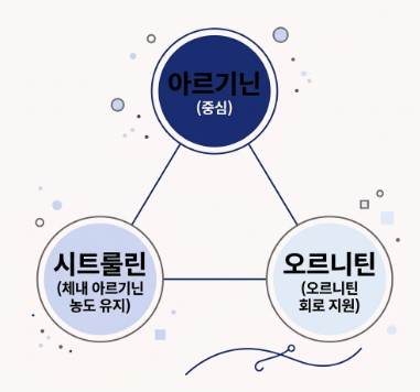 아르기닌 단독 섭취보다 시트룰린이나 오르니틴이 배합된 제품을 선택하세요. 이들은 체내 아르기닌 농도를 더 오래 유지시켜 아르기닌의 효능이 지속되도록 돕습니다.
