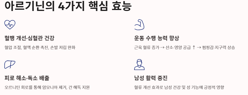 - 아르기닌의 효능은 산화질소 생성을 통한 혈류 개선과 피로 해소에 특화되어 있습니다.