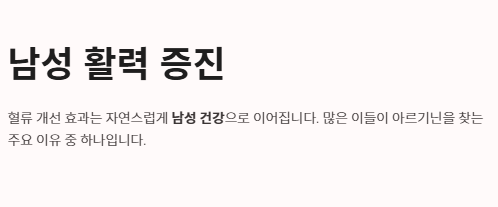 - 운동 수행 능력 향상과 남성 활력 증진에 탁월한 아르기닌의 효능을 보입니다.