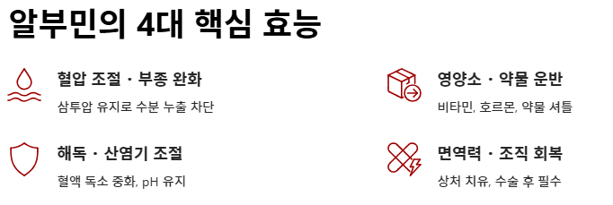 - 해독 작용 및 산염기 조절: 혈액 속 독소를 중화하고 체내 산도($pH$)를 일정하게 유지하는 것도 중요한 알부민의 효능에 해당합니다.