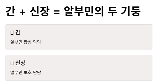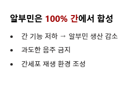 - 간에서 합성되고 신장에서 보호되므로 두 장기의 건강이 알부민의 효능과 직결됩니다.