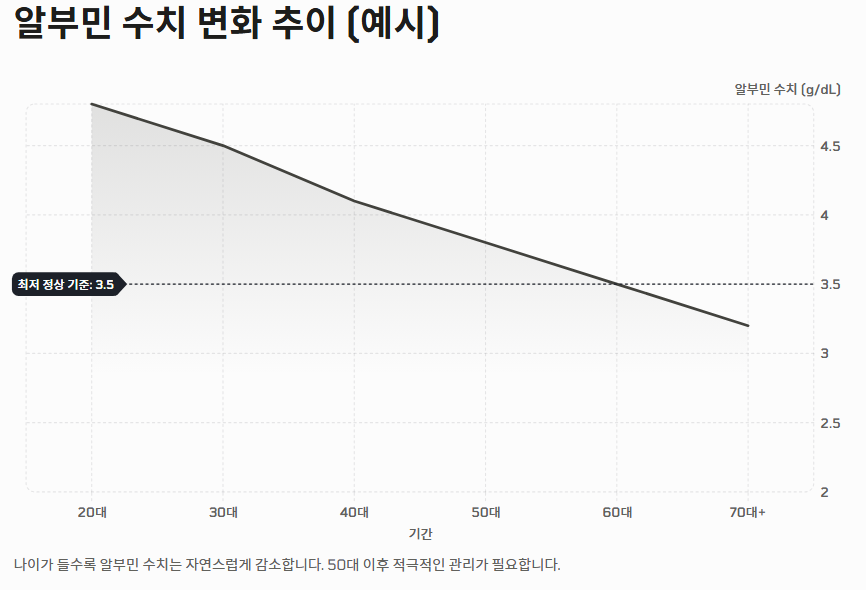- 예방 영양학적 관점: 일반인들에게는 영양제나 식단을 통한 관리가 강조됩니다. 만성 피로나 노인성 근감소증 예방을 위해 알부민의 효능을 기력 회복의 지표로 삼습니다. 즉, 삶의 질을 높이고 면역력을 유지하기 위한 '체력의 기초'로서 알부민의 효능을 중요하게 여깁니다.