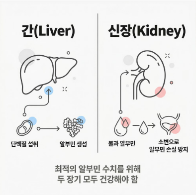 - 간과 신장의 집중 관리: 아무리 단백질을 많이 먹어도 간 기능이 떨어지면 알부민을 만들지 못하고, 신장이 망가지면 알부민이 소변으로 빠져나갑니다. 두 장기를 건강하게 유지하는 것이 알부민의 효능을 보존하는 핵심입니다.
