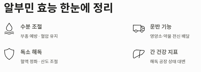 - 수분 조절: 부종을 막고 혈압 유지에 기여하는 알부민의 효능