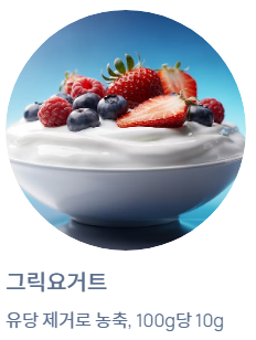 - 그릭요거트: 유당 제거로 단백질 농축, 100g당 10g