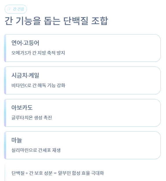 단백질+간 보호 성분이 함께 들어간 알부신 많은 음식을 먹으면 알부민 합성 효율이 극대화됩니다.