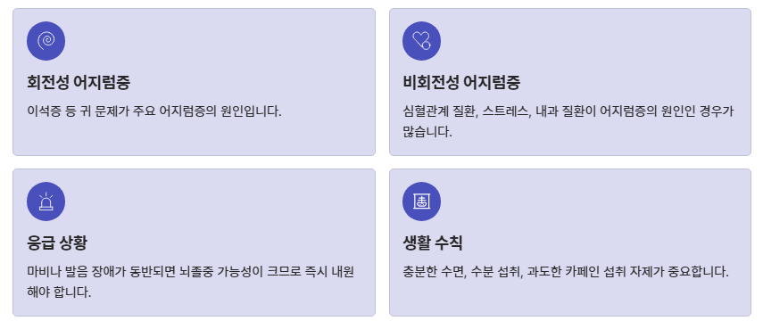 방대한 어지럼증의 원인과 대처법을 요약하면 다음과 같습니다.