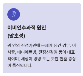 - 이비인후과적 원인 (말초성): 가장 흔한 어지럼증의 원인으로 귀 안의 전정기관에 문제가 생긴 경우입니다. 이석증, 메니에르병, 전정신경염 등이 대표적이며, 세상이 빙빙 도는 듯한 '현훈' 증상이 특징입니다.