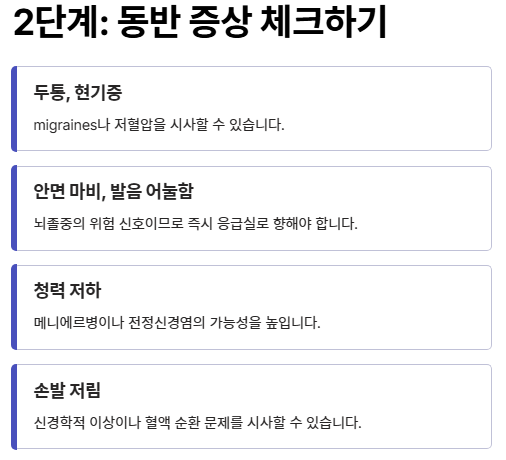 두통, 안면 마비, 발음 어눌함, 청력 저하 등이 함께 나타나는지 살피세요. 만약 신경학적 이상이 동반된다면 이는 뇌혈관 문제를 시사하는 긴급한 어지럼증의 원인이므로 즉시 응급실로 향해야 합니다.