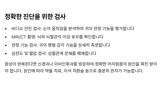 - 비회전성 어지럼증: 심혈관계 질환, 스트레스, 내과 질환이 어지럼증의 원인인 경우가 많음.