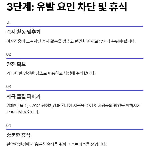 어지럼증이 나타났을 때 당황하지 않고 대처하기 위한 단계별 행동 요령입니다.