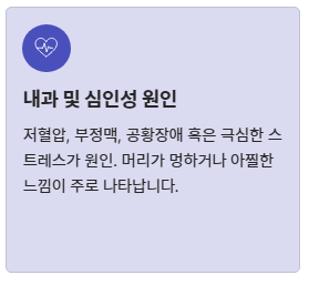 - 내과 및 심인성 원인: 저혈압, 부정맥, 공황장애 혹은 극심한 스트레스가 어지럼증의 원인이 될 수 있습니다. 이때는 머리가 멍하거나 아찔한 느낌이 주로 나타납니다.