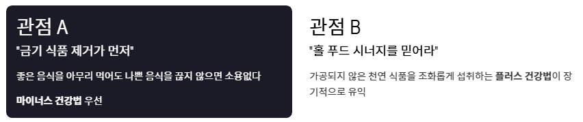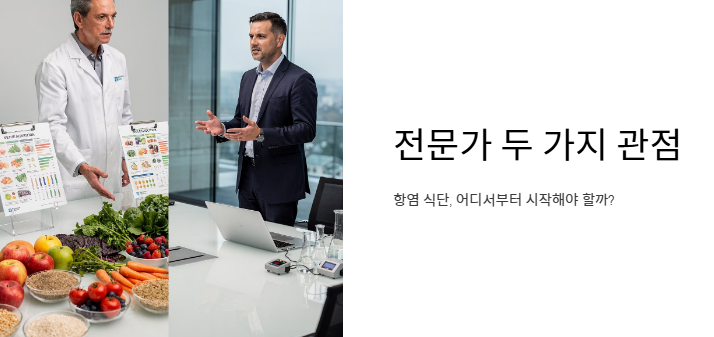 - 관점 A: "식단의 구성보다 '금기 식품' 제거가 먼저다" 일부 영양 전문가들은 아무리 염증에 좋은 음식을 많이 먹어도 액상과당, 정제 탄수화물(흰 빵, 설탕), 트랜스 지방을 끊지 않으면 소용없다고 주장합니다. 불난 집에 부채질하면서 물을 붓는 격이라는 논리입니다. 즉, 나쁜 음식을 빼는 '마이너스' 건강법이 우선이라는 시각입니다.
