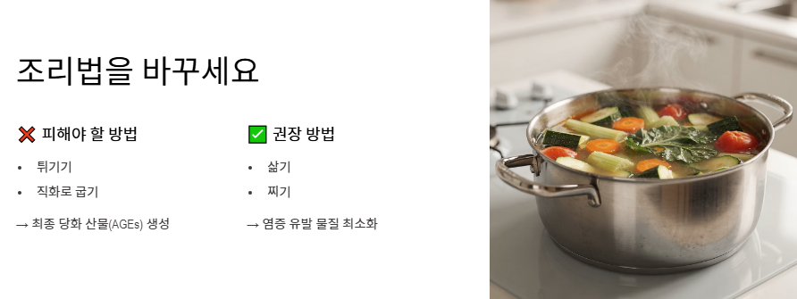 - 조리법의 변화: 튀기거나 직화로 굽는 요리는 '최종 당화 산물(AGEs)'이라는 염증 유발 물질을 만듭니다. 가급적 삶거나 찌는 방식으로 염증에 좋은 음식을 조리하세요.