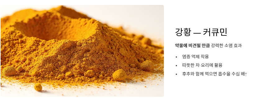 강황 속에 들어있는 커큐민 성분은 약물에 비견될 만큼 강력한 소염 효과를 자랑하는 염증에 좋은 음식입니다. 생강 역시 진저롤 성분이 함유되어 있어 통증을 완화하고 혈액순환을 돕습니다. 따뜻한 차나 요리에 곁들여 꾸준히 섭취하면 효과적입니다.