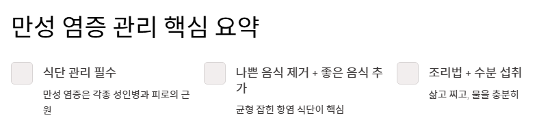 오늘 살펴본 몸속 만성 염증을 다스리는 핵심 내용을 정리합니다.