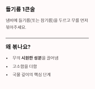 - 무를 기름에 먼저 볶아 시원하고 고소한 맛을 베이스로 잡습니다.