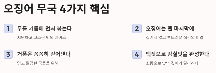 오늘 정리한 오징어 무국 끓이는 방법의 핵심 내용을 요약해 드립니다.