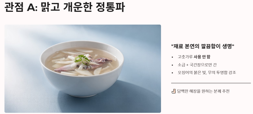 - 관점 A: 맑고 개운한 정통파 "재료 본연의 깔끔함이 생명"이라는 의견입니다. 고춧가루를 쓰지 않고 소금과 국간장으로만 간을 맞추며, 오징어의 붉은 빛과 무의 투명함을 강조합니다. 담백한 해장을 원하는 분들이 선호하는 오징어 무국 끓이는 방법입니다.